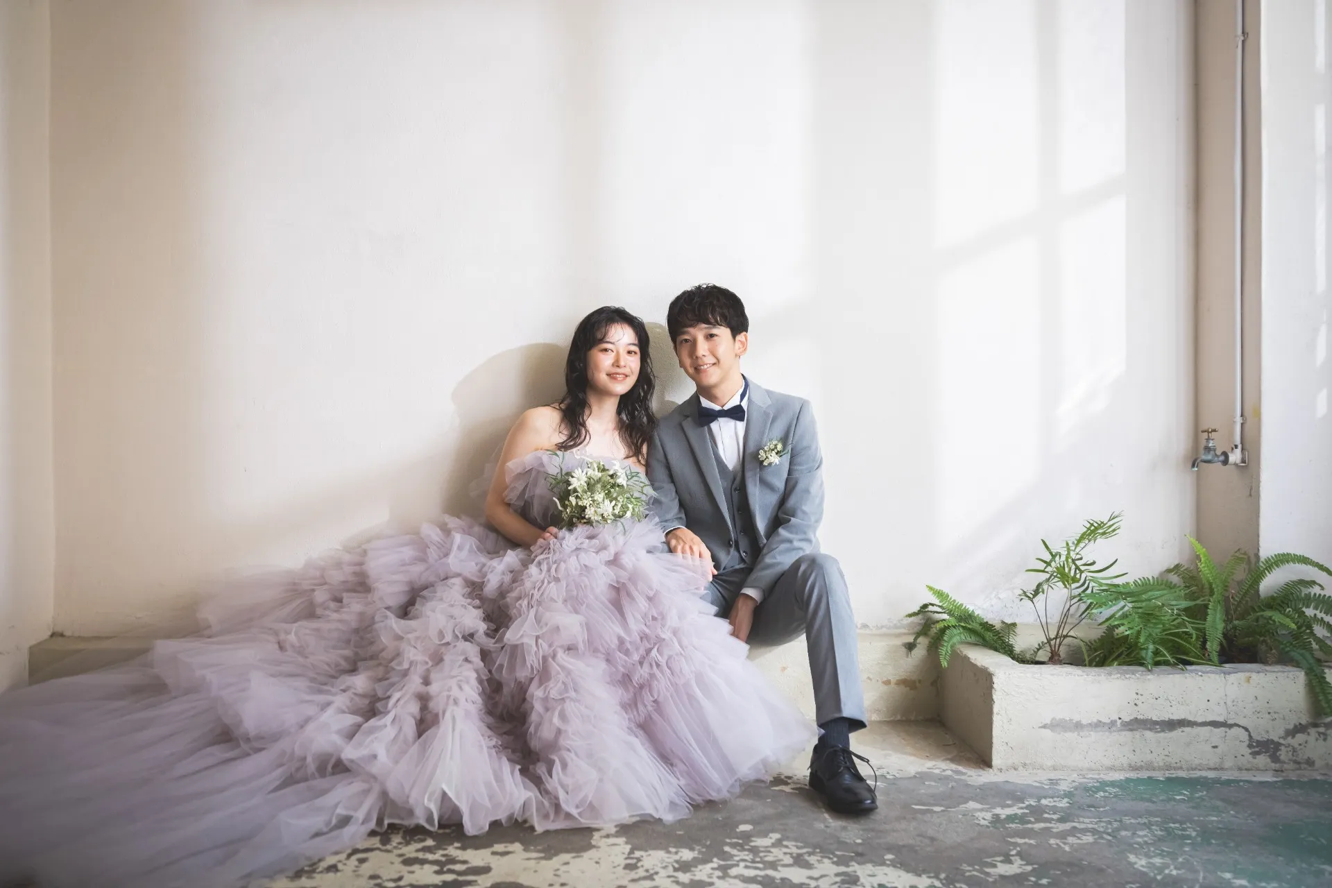 シンプルな空間に“幸せの鳥”をイメージした大きなフラワーオブジェの存在感。お二人の表情が映えるように、ライティングも組み合わせてここでしか表現できない世界観を作り上げます。壁面の1角をピンク色で仕上げていて、キャッチーなフォトウエディングも撮影できます。