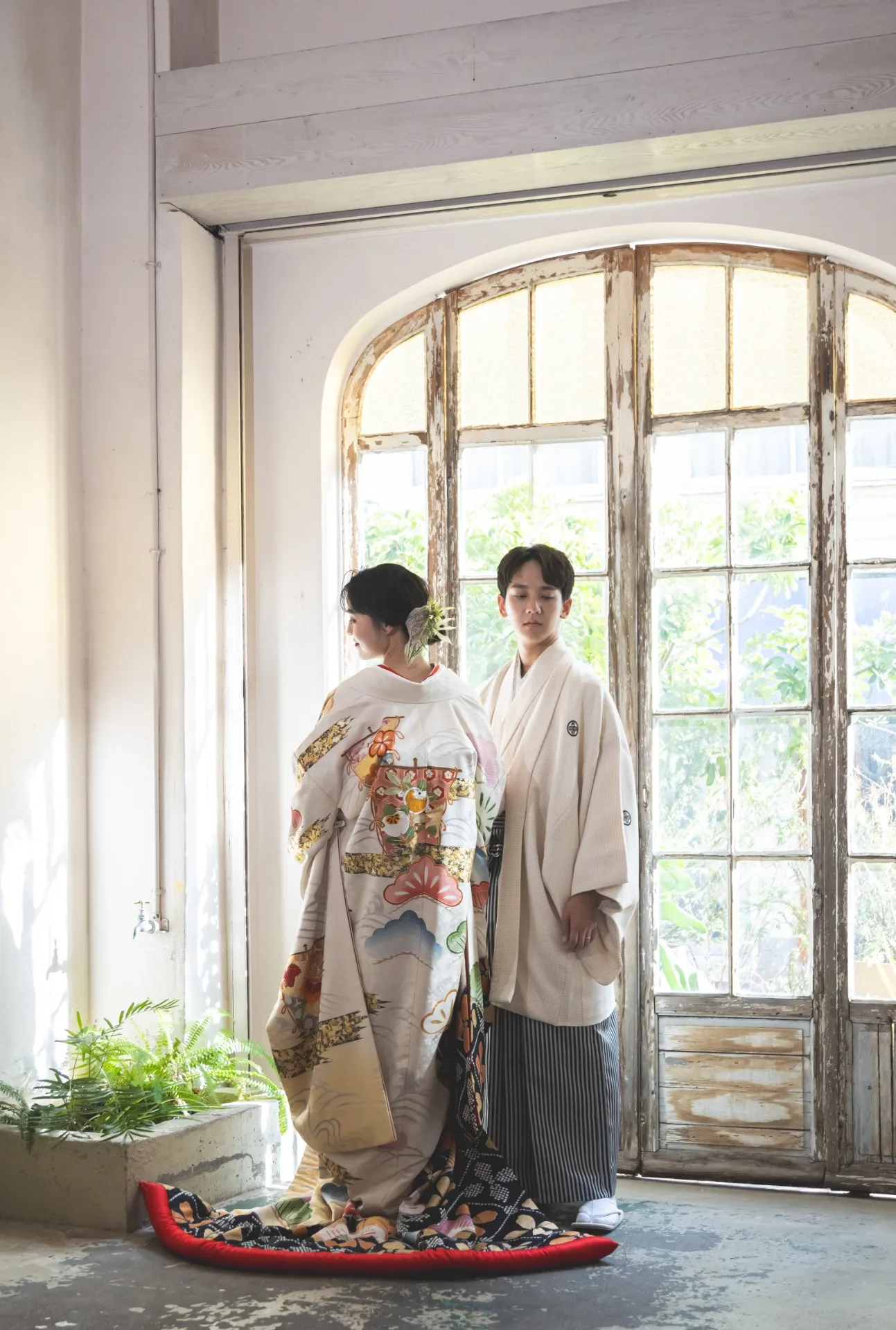 フランスから取り寄せた本物のヴィンテージ扉があるエントランス空間。床もヴィンテージ感のある味わい深い雰囲気で、海外の街角にあるおしゃれなショップのような世界観を作っています。シンプルな空間に、光で強弱を調整しながら、二人らしさが残るフォトウエディングを実現します。